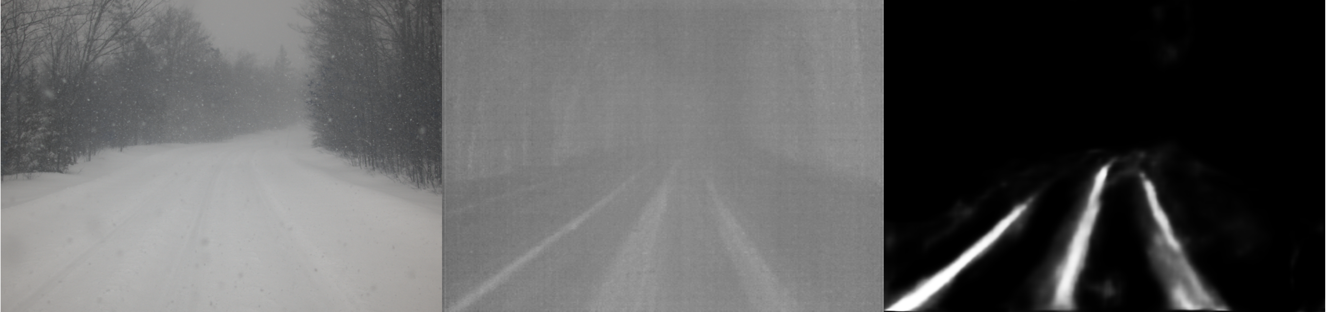 We present a wheel track detection system that leverages RGB- Thermal (RGB-T) imaging, where thermal channels reveal critical temperature differentials between compacted tracks and loose snow- tracks exhibit higher thermal inertia and lower reflectivity, emitting stronger radiation signatures even in visually homogeneous conditions. By fusing these distinctive thermal patterns with RGB spatial information, our method reliably identifies navigable tracks, enabling robust path-following in complete white-out conditions where snow textures and terrain features become indistinguishable.